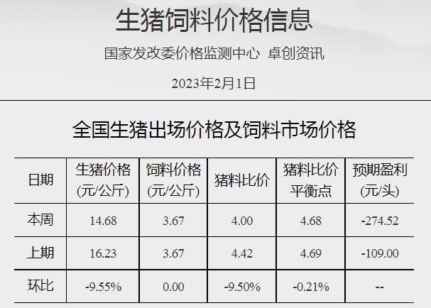 2月6日电据国家发改委价格监测中心网站消息,截至2023年2月1日当周,全国猪料比价为4.00,较春节前(1月18日)下降9.50%。按目前价格及成本推算,未来生猪养殖头均亏损为274.52元。当周国内猪价以降为主。随着春节假期收尾,终端消费渐显疲软,屠宰企业开工率低位调整,整体收购难度不大,压价情绪较浓,而养殖端虽有抗价情绪,但生猪出栏压力仍存,周内猪价小幅走低。