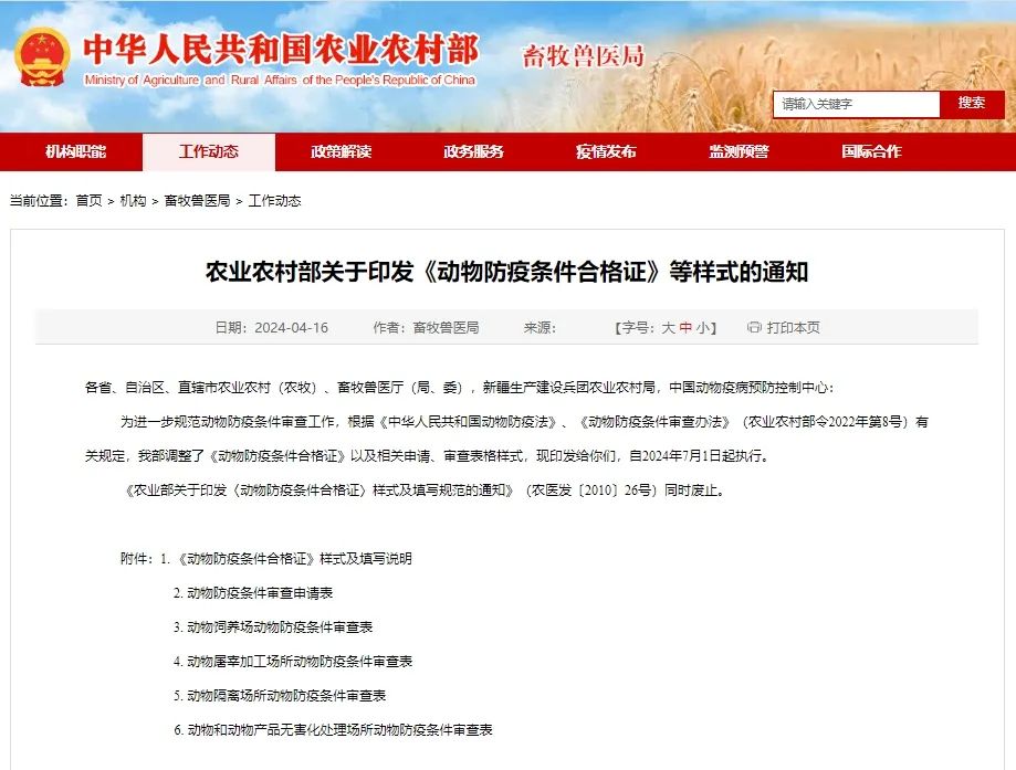 农业农村部关于印发《动物防疫条件合格证》等样式的通知