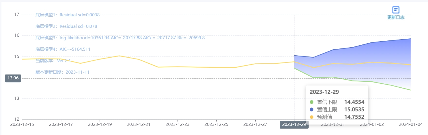 玄田算法是由项目课题组团队原创的非经典逻辑数值聚合理论和不确定性预测方法,构建了基于一致模算子的生猪价格预测模型。该模型采用的聚合函数及一致模相关理论与方法已获得多项国家自然科学基金和省级自然科学资金资助,并获得多项省级自然科学奖奖项。12月29日预测猪价为14.5772,置信区间在14.0946--15.0651之间。12月30日预测猪价为14.7556;12月30日预测猪价为14.7301。