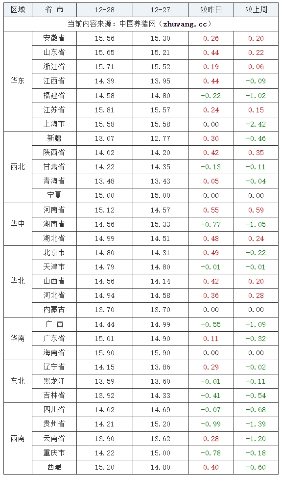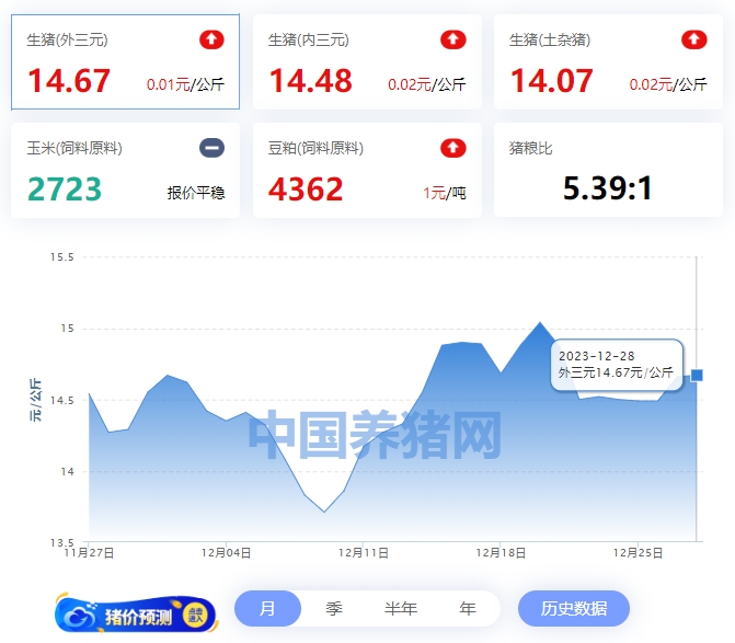 相较昨日(2023年12月26日)14.66元/公斤,价格上涨了0.01元/公斤;