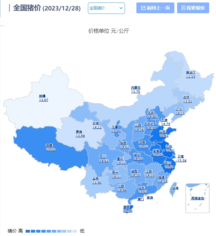 具体来看部分地区的生猪价格,上海市今日生猪(外三元)的价格为15.58元/公斤,宁夏回族自治区今日生猪(外三元)的价格为15.00元/公斤,湖北省今日生猪(外三元)的价格为14.99元/公斤,内蒙古自治区今日生猪(外三元)的价格为13.70元/公斤,海南省今日生猪(外三元)的价格为15.90元/公斤,吉林省今日生猪(外三元)的价格为13.92元/公斤,西藏自治区今日生猪(外三元)的价格为15.20元/公斤,广西壮族自治区今日生猪(外三元)的价格为14.44元/公斤,天津市今日生猪(外三元)的价格为14.79元/公斤,青海省今日生猪(外三元)的价格为13.48元/公斤。