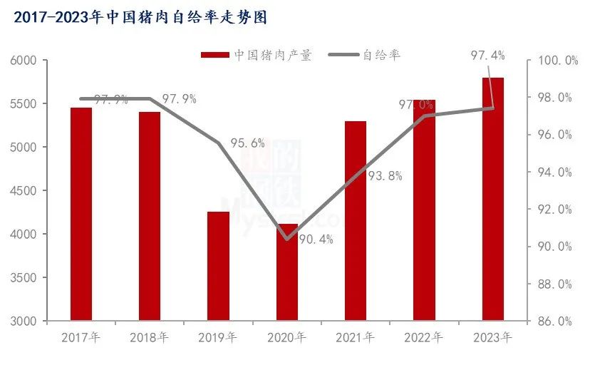 产量在5794万吨,环比增量4.6%,占全球供应超50%。我国自给率一般维持在95%以上,2020年受猪瘟影响,降至90%,后期随着产能恢复,2023年电子游艺平台