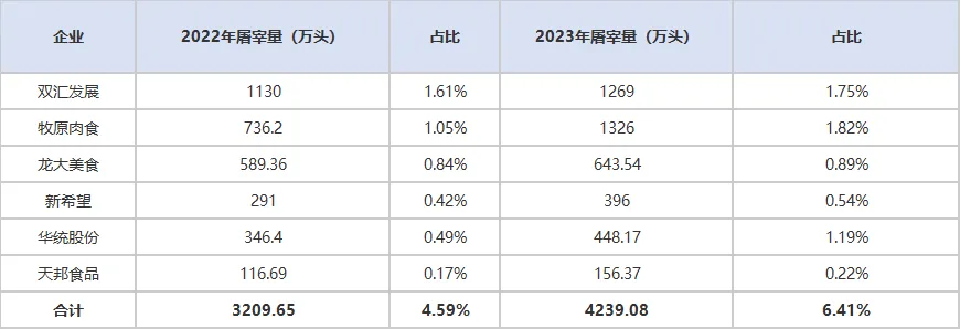 在国外,规模屠宰企业占据绝对市场份额,美国、荷兰、丹麦呈寡头垄断局面,美国、荷兰前三强生猪屠宰企业市场份额分别约占50%和75%,丹麦最大的屠宰企业占到80%。而我国屠宰行业依旧处于分散竞争型阶段,我国生猪屠宰行业产能集中度低,发展进程缓慢,(1)行业门槛低、自宰自杀和私宰情况较多;(2)设计产能高,利用率低,内卷严重;(3)监管体系不完善等方面。下面来看下我国六家大型屠宰企业,屠宰量变化及占比情况。