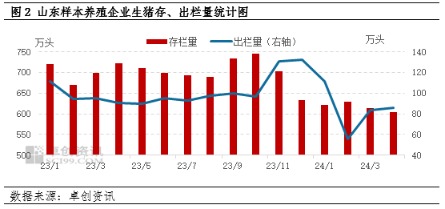 卓创资讯监测山东地区样本养殖企业4月份生猪存栏量为603.71万头,环比降幅1.64%,同比降幅16.46%。卓创资讯评估2023年四季度山东地区生猪存栏受损程度规模场与散户比例约为3:7,因此散户存栏受损更为严重,加剧了春节假期过后山东生猪供应紧缺,且2-4月份空栏率维持在较高水平,为5月份二次育肥补栏集中入场提供了空间。