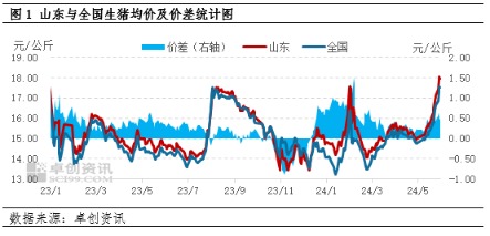 据卓创资讯监测数据显示,山东生猪均价由4月30日的15.01元/公斤最高涨至5月29日的18.06元/公斤,累计涨幅20.32%。全国外三元生猪交易均价由4月30日的14.79元/公斤最高涨至5月29日的17.57元/公斤,累计涨幅18.80%。山东与全国生猪价差由5月6日的0.23元/公斤最高增至28日的0.64元/公斤,截至30日,5月份山东与全国生猪价差平均为0.39元/公斤,环比上月扩大0.15元/公斤。因2023年四季度猪病影响,北方地区生猪存栏受损,导致2024年春季过后北方地区生猪供应出现缺口,尤其5月份山东地区标猪供应断档,屠宰企业收购不畅,支撑猪价上涨。