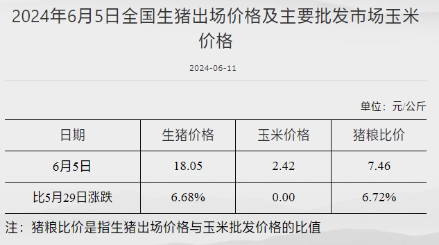 2024年6月5日猪粮比:生猪价格及玉米批发价格